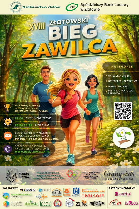 Szanowni Państwo, jako partnerzy wydarzenia z przyjemnością zapraszamy do udziału w XVIIII Złotowskim Biegu Zawilca, który odbędzie się w dniach 24-25 kwietnia 2026 r. w malowniczym Parku Zwierzyniec w Złotowie. To doskonała okazja, by aktywnie spędzić czas, cieszyć się pięknem przyrody i wziąć udział w sportowej rywalizacji w przyjaznej atmosferze. Zachęcamy do udziału wszystkich miłośników ruchu i dobrej zabawy – zarówno biegaczy, jak i kibiców! Szczegółowe informacje, zapisy oraz regulamin znajdują się na stronie: Do zobaczenia na starcie!