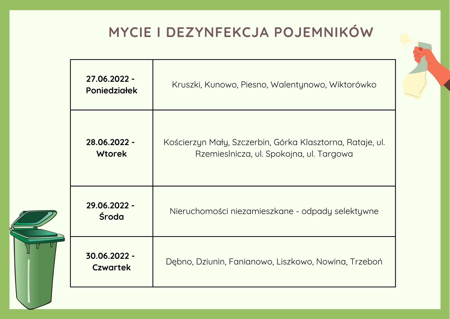 Szanowni Państwo, uprzejmie przypominamy o trwającym myciu i dezynfekcji pojemników na terenie obszaru działania Związku Gmin Krajny. Prosimy, aby pojemniki były wystawione od godz. 6:00 do drogi publicznej oraz o pozostawienie pojemników po odbiorze odpadów aż do czasu ich umycia. Harmonogram na najbliższe dni: 27.06.2022 - Poniedziałek Kruszki, Kunowo, Piesno, Walentynowo, Wiktorówko 28.06.2022 - Wtorek Kościerzyn Mały, Szczerbin, Górka Klasztorna, Rataje, ul. Rzemieslnicza, ul. Spokojna, ul. Targowa 29.06.2022 - Środa Nieruchomości niezamieszkane - odpady selektywne 30.06.2022 - Czwartek Dębno, Dziunin, Fanianowo, Liszkowo, Nowina, Trzeboń Pełna treść harmonogramu mycia i dezynfekcji pojemników -> PDF To już ostatnie terminy przeprowadzonej akcji. Kolejne mycie i dezynfekcja pojemników na terenie ZGK zaplanowane jest w drugiej połowie 2022r.
