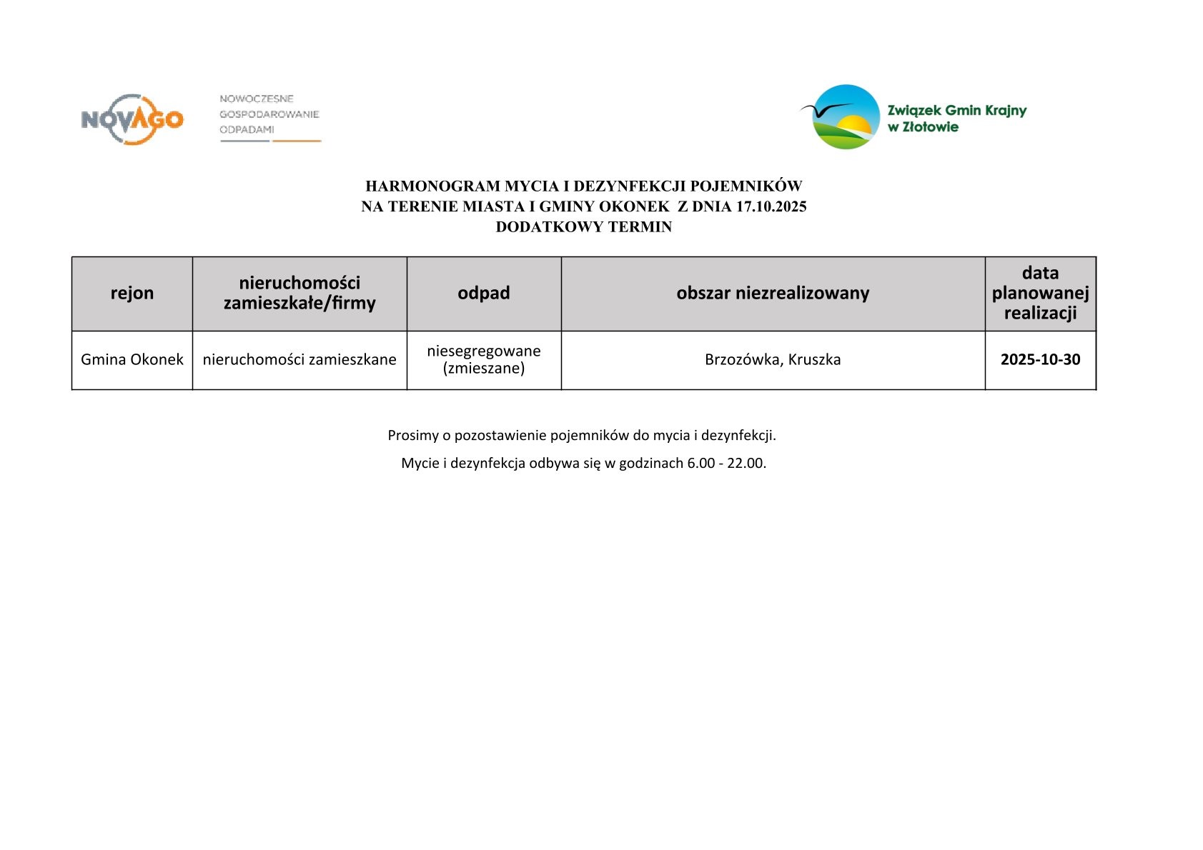 Szanowni Państwo, w imieniu Operatora, tj. Novago Złotów Sp. z o.o., uprzejmie informujemy, że z powodu awarii pojazdu myjącego w dniu 16 października 2025 r. nie została zrealizowana usługa mycia i dezynfekcji pojemników na terenie miejscowości Brzozówka oraz Kruszka (nieruchomości zamieszkane). W związku z powyższym wyznaczono dodatkowy termin realizacji usługi. Mycie i dezynfekcja pojemników z nieruchomości zamieszkanych położonych w tych lokalizacjach odbędzie się 30.10.2025 roku. Szczegóły w galerii poniżej.